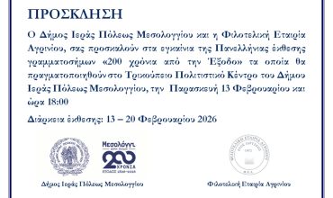 Η Φιλοτελική Εταιρεία Αγρινίου, με χαρά σας προσκαλεί στα εγκαίνια της έκθεσης “200 χρόνια από την έξοδο”, την Παρασκευή 13 Φεβρουαρίου, ώρα 18:00 στο ανακαινισμένο Τρικούπειο Πολιτιστικό Κέντρο, στο Μεσολόγγι. …